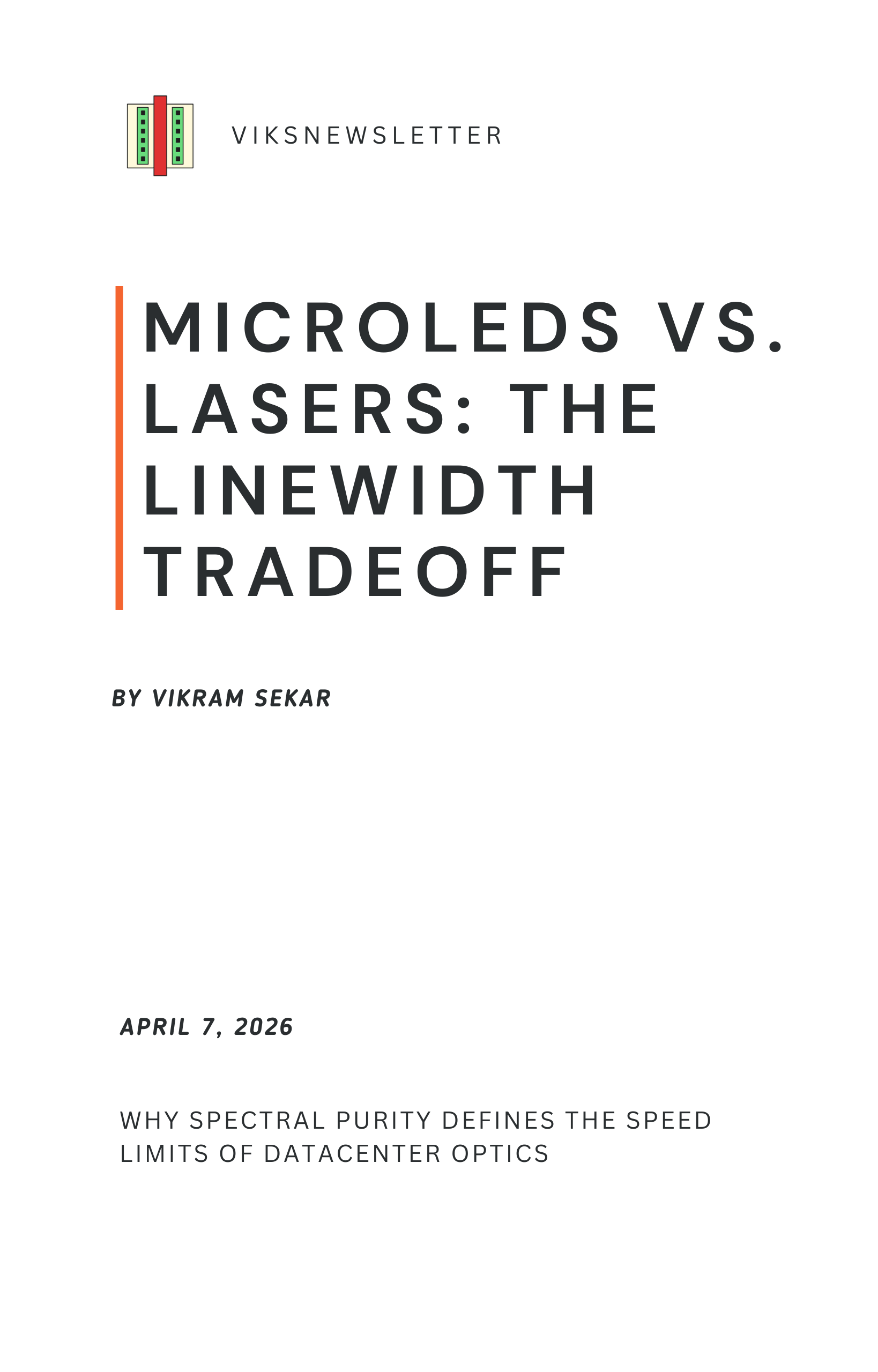 MicroLEDs vs. Lasers: The Linewidth Tradeoff: An explanation of how spectral purity (linewidth) dictates speed limits for optical links.